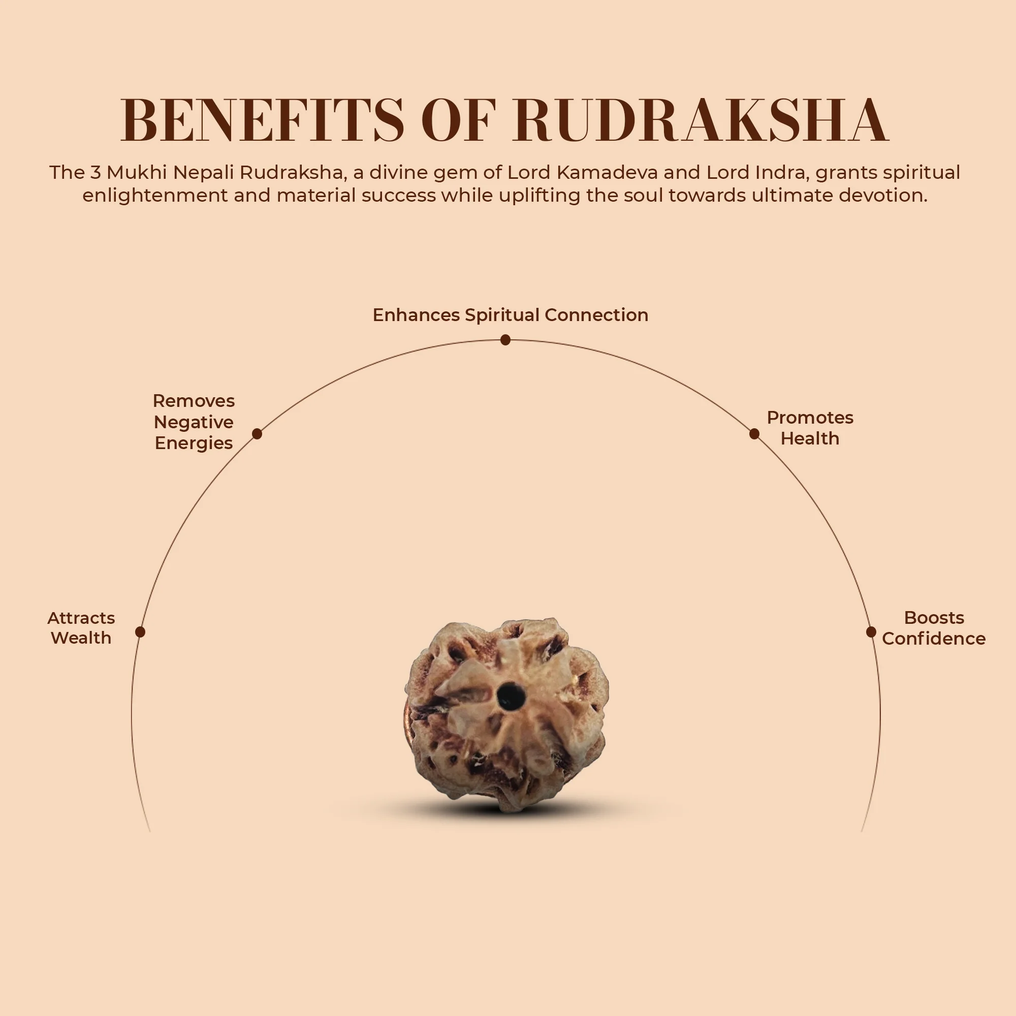 Three Mukhi Rudraksha Nepali is a bead with has three faces or line which depicts Holy Trinity- Lord Brahma, Lord Vishnu, and Lord Mahesh.